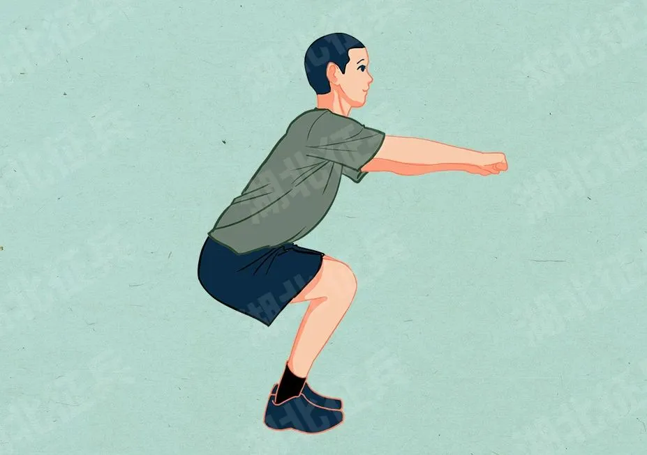检查方法:双手抱头,双足并拢,双足跟踮起,挺胸收腹,上身保持正直,进行深度下蹲。