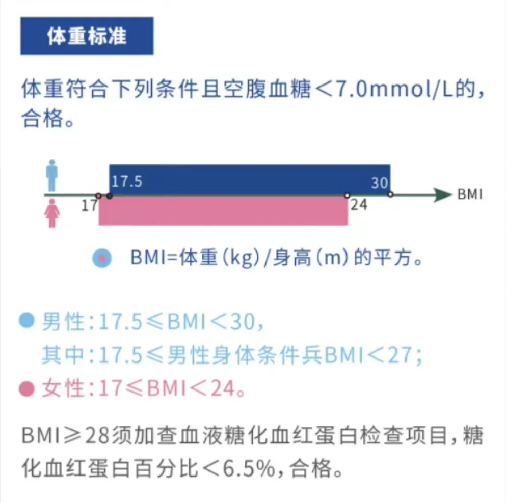 体检标准:泌尿、血液、内分泌系统疾病,代谢性疾病,免疫性疾病,不合格(主要原因为转氨酶、肌酐、血小板、尿酮等超标)。